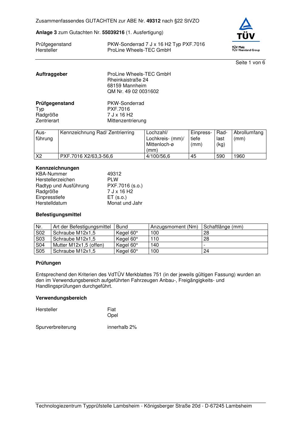 Dieses Gutachten (ABE) bezieht sich auf die Alufelge Proline PXF.7016 in der Ausführung 7Jx16 ET 0, Mittenloch 0 mm (KBA 49312). Im PDF findest du typischerweise zulässige Reifengrößen, Auflagen/Anbauhinweise und – je nach Dokument – Hinweise zur Eintragung.