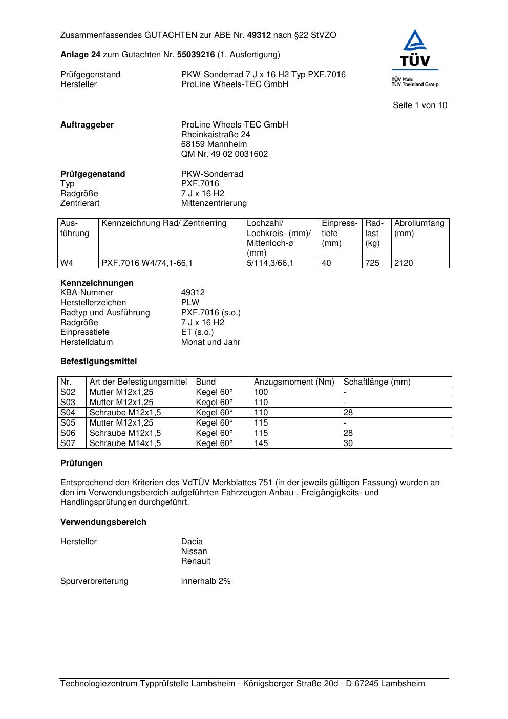 Dieses Gutachten (ABE) bezieht sich auf die Alufelge Proline PXF.7016 in der Ausführung 7Jx16 ET 0, Mittenloch 0 mm (KBA 49312). Im PDF findest du typischerweise zulässige Reifengrößen, Auflagen/Anbauhinweise und – je nach Dokument – Hinweise zur Eintragung.