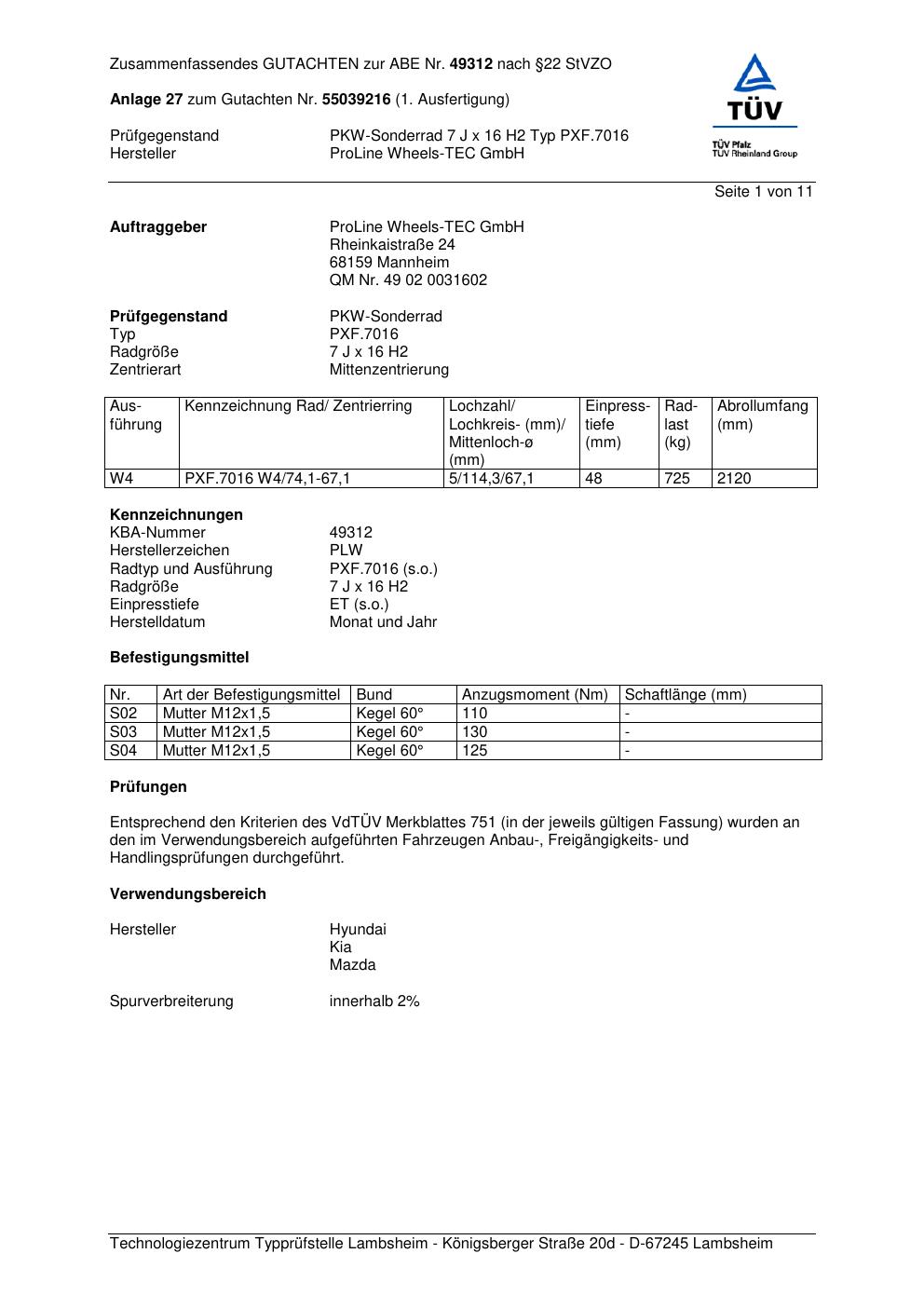 Dieses Gutachten (ABE) bezieht sich auf die Alufelge Proline PXF.7016 in der Ausführung 7Jx16 ET 0, Mittenloch 0 mm (KBA 49312). Im PDF findest du typischerweise zulässige Reifengrößen, Auflagen/Anbauhinweise und – je nach Dokument – Hinweise zur Eintragung.