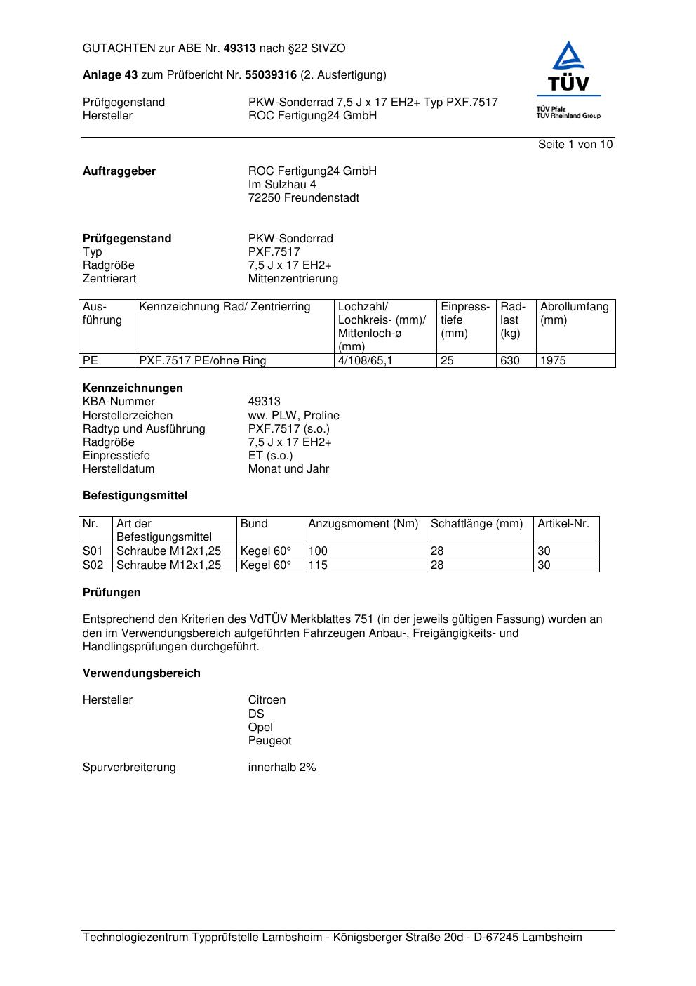 Dieses Gutachten (ABE) bezieht sich auf die Alufelge Proline PXF.7517 in der Ausführung 7.5Jx17 ET 0, Mittenloch 0 mm (KBA 49313). Im PDF findest du typischerweise zulässige Reifengrößen, Auflagen/Anbauhinweise und – je nach Dokument – Hinweise zur Eintragung.