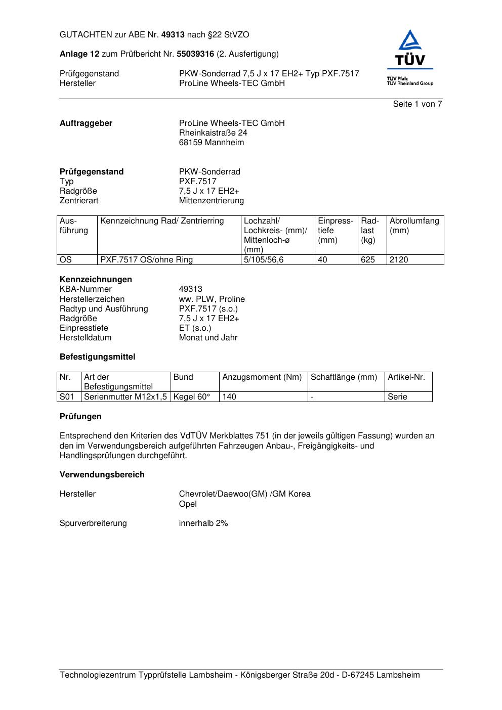 Dieses Gutachten (ABE) bezieht sich auf die Alufelge Proline PXF.7517 in der Ausführung 7.5Jx17 ET 0, Mittenloch 0 mm (KBA 49313). Im PDF findest du typischerweise zulässige Reifengrößen, Auflagen/Anbauhinweise und – je nach Dokument – Hinweise zur Eintragung.