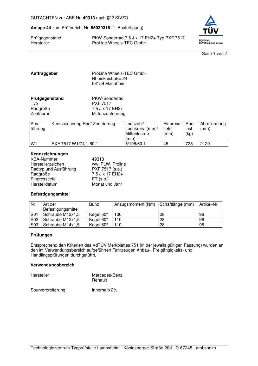 Dieses Gutachten (ABE) bezieht sich auf die Alufelge Proline PXF.7517 in der Ausführung 7.5Jx17 ET 0, Mittenloch 0 mm (KBA 49313). Im PDF findest du typischerweise zulässige Reifengrößen, Auflagen/Anbauhinweise und – je nach Dokument – Hinweise zur Eintragung.
