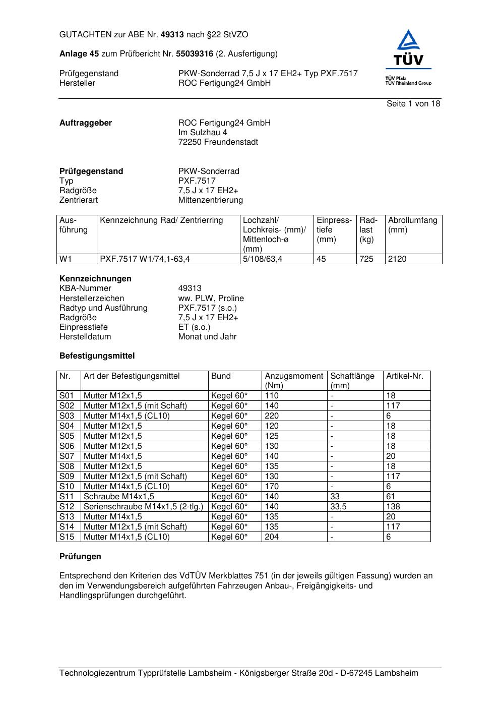 Dieses Gutachten (ABE) bezieht sich auf die Alufelge Proline PXF.7517 in der Ausführung 7.5Jx17 ET 0, Mittenloch 0 mm (KBA 49313). Im PDF findest du typischerweise zulässige Reifengrößen, Auflagen/Anbauhinweise und – je nach Dokument – Hinweise zur Eintragung.