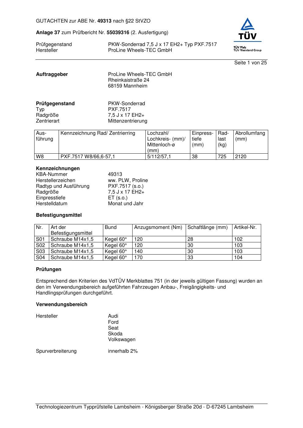 Dieses Gutachten (ABE) bezieht sich auf die Alufelge Proline PXF.7517 in der Ausführung 7.5Jx17 ET 0, Mittenloch 0 mm (KBA 49313). Im PDF findest du typischerweise zulässige Reifengrößen, Auflagen/Anbauhinweise und – je nach Dokument – Hinweise zur Eintragung.