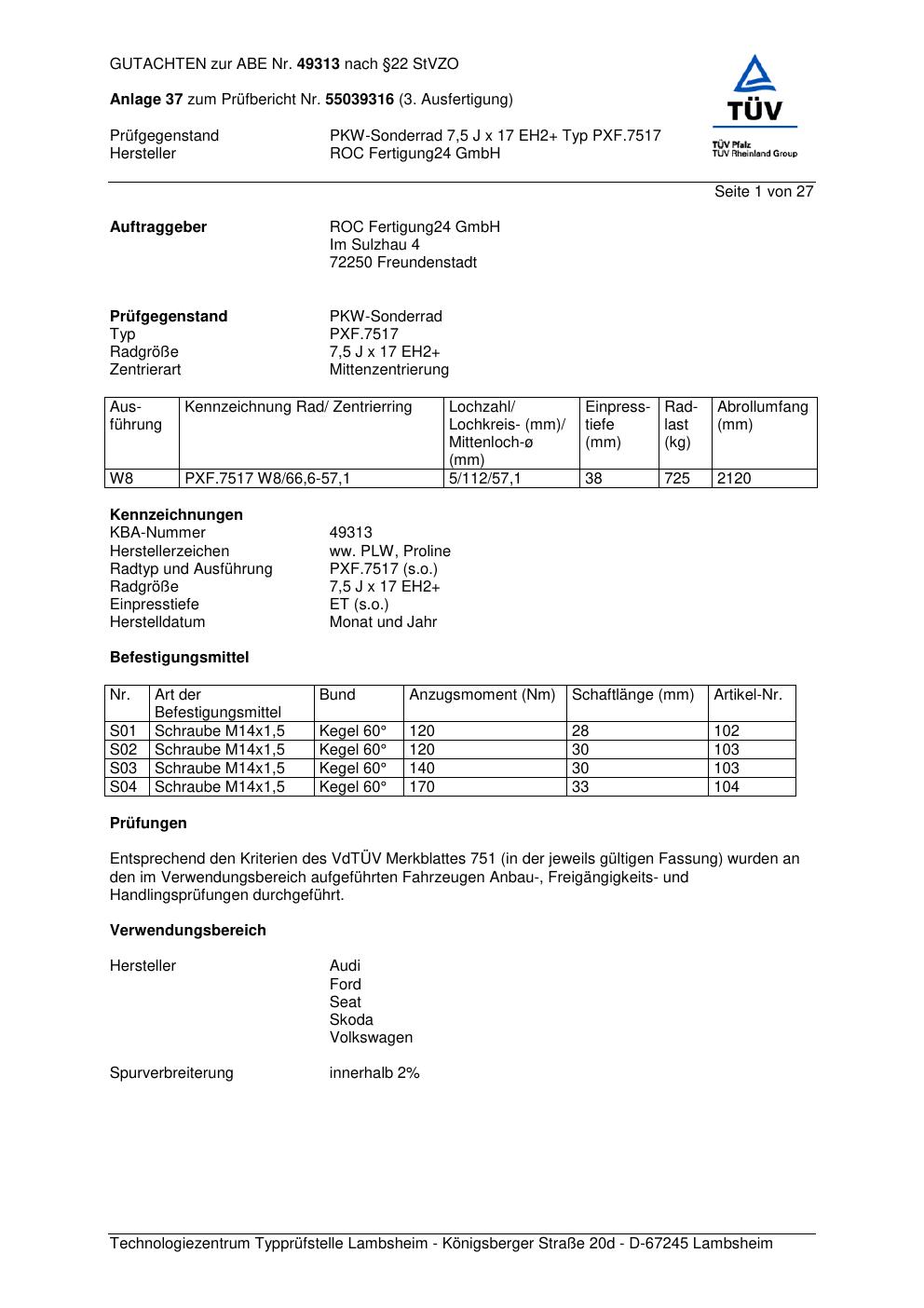 Dieses Gutachten (ABE) bezieht sich auf die Alufelge Proline PXF.7517 in der Ausführung 7.5Jx17 ET 0, Mittenloch 0 mm (KBA 49313). Im PDF findest du typischerweise zulässige Reifengrößen, Auflagen/Anbauhinweise und – je nach Dokument – Hinweise zur Eintragung.