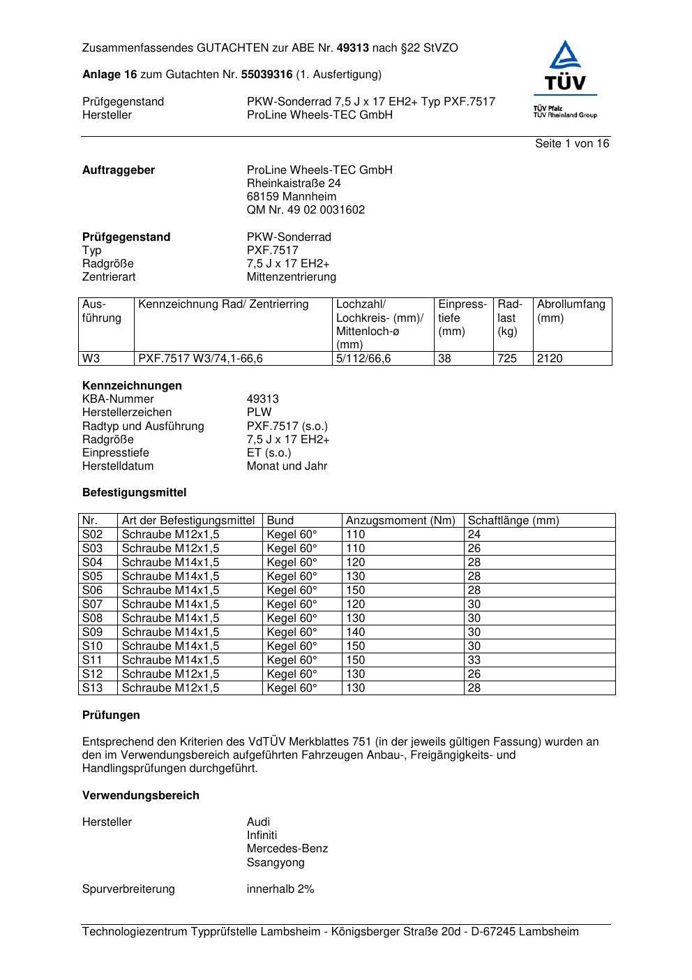 Felgengutachten / ABE für Alufelgen Proline PXF.7517 (7.5Jx17 ET 0, Mittenloch 0 mm) mit KBA 49313 (Zertifikatsnummer KBA 49313). Hier kostenlos als PDF herunterladen. Der Download-Link ist 24 Stunden gültig und kann bis zu zwei Mal verwendet werden.
