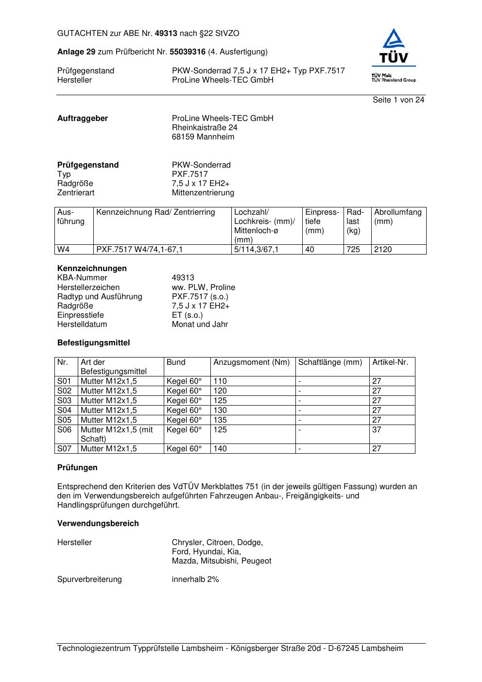 Dieses Gutachten (ABE) bezieht sich auf die Alufelge Proline PXF.7517 in der Ausführung 7.5Jx17 ET 0, Mittenloch 0 mm (KBA 49313). Im PDF findest du typischerweise zulässige Reifengrößen, Auflagen/Anbauhinweise und – je nach Dokument – Hinweise zur Eintragung.
