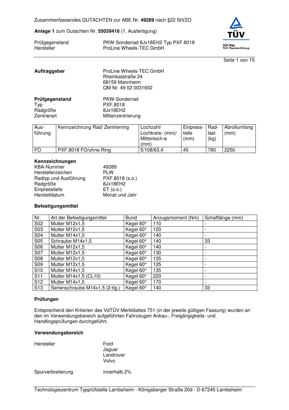 Dieses Gutachten (ABE) bezieht sich auf die Alufelge Proline PXF.8018 in der Ausführung 8Jx18 ET 0, Mittenloch 0 mm (KBA 49289). Im PDF findest du typischerweise zulässige Reifengrößen, Auflagen/Anbauhinweise und – je nach Dokument – Hinweise zur Eintragung.