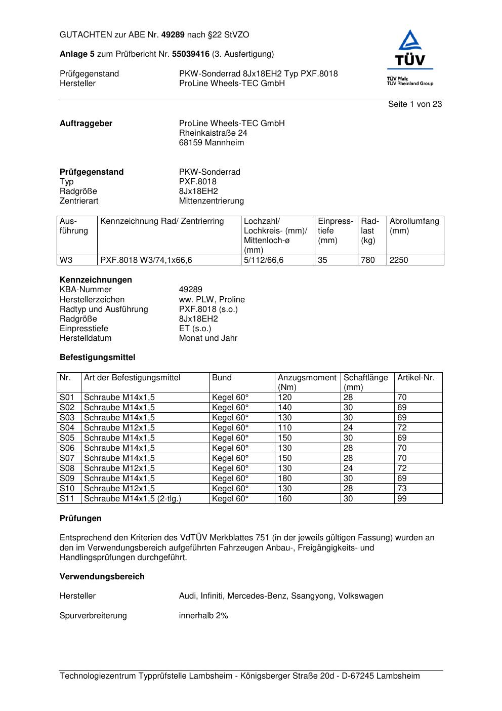 Felgengutachten / ABE für Alufelgen Proline PXF.8018 (8Jx18 ET 0, Mittenloch 0 mm) mit KBA 49289 (Zertifikatsnummer KBA 49289). Hier kostenlos als PDF herunterladen. Der Download-Link ist 24 Stunden gültig und kann bis zu zwei Mal verwendet werden.