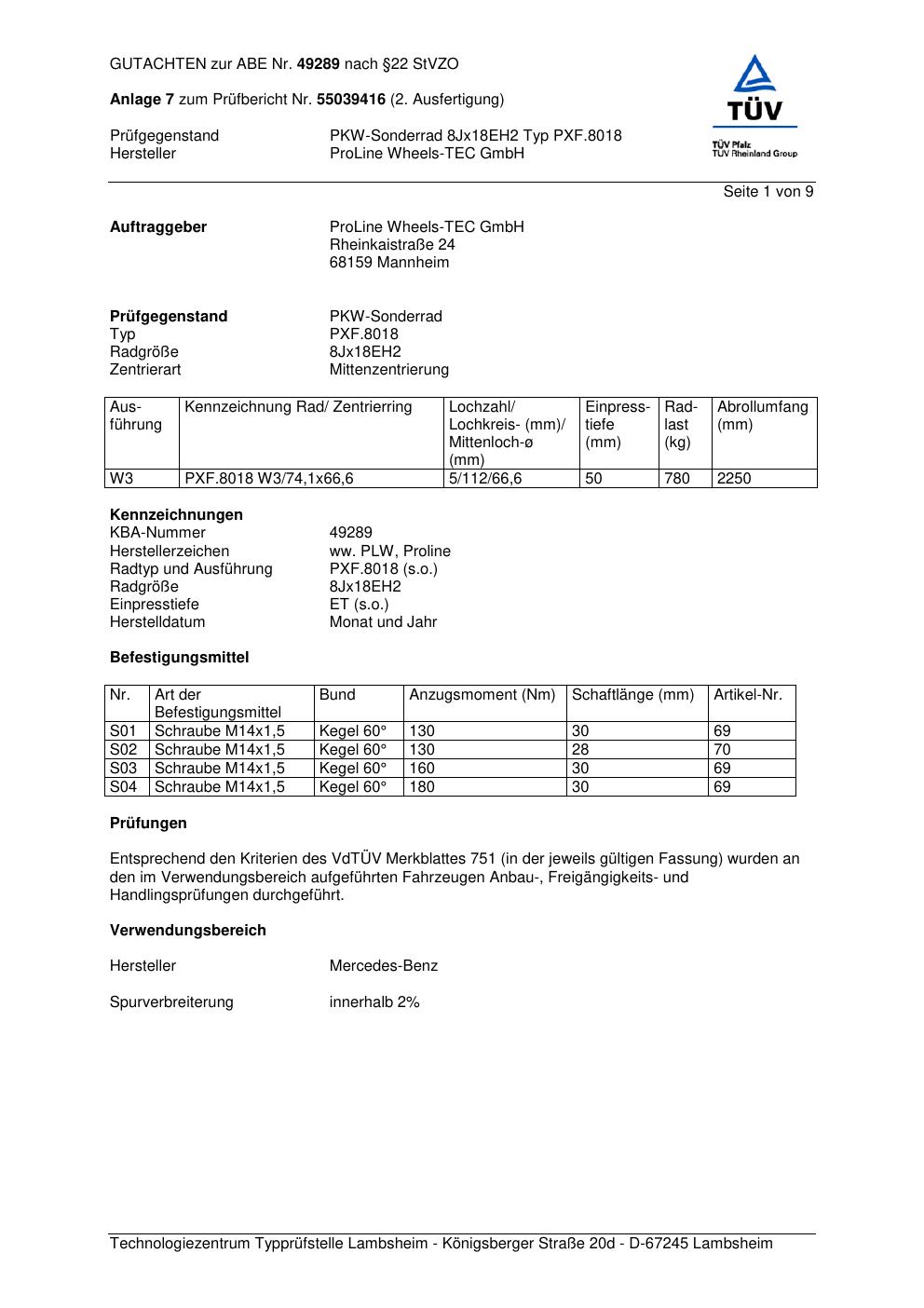 Felgengutachten / ABE für Alufelgen Proline PXF.8018 (8Jx18 ET 0, Mittenloch 0 mm) mit KBA 49289 (Zertifikatsnummer KBA 49289). Hier kostenlos als PDF herunterladen. Der Download-Link ist 24 Stunden gültig und kann bis zu zwei Mal verwendet werden.