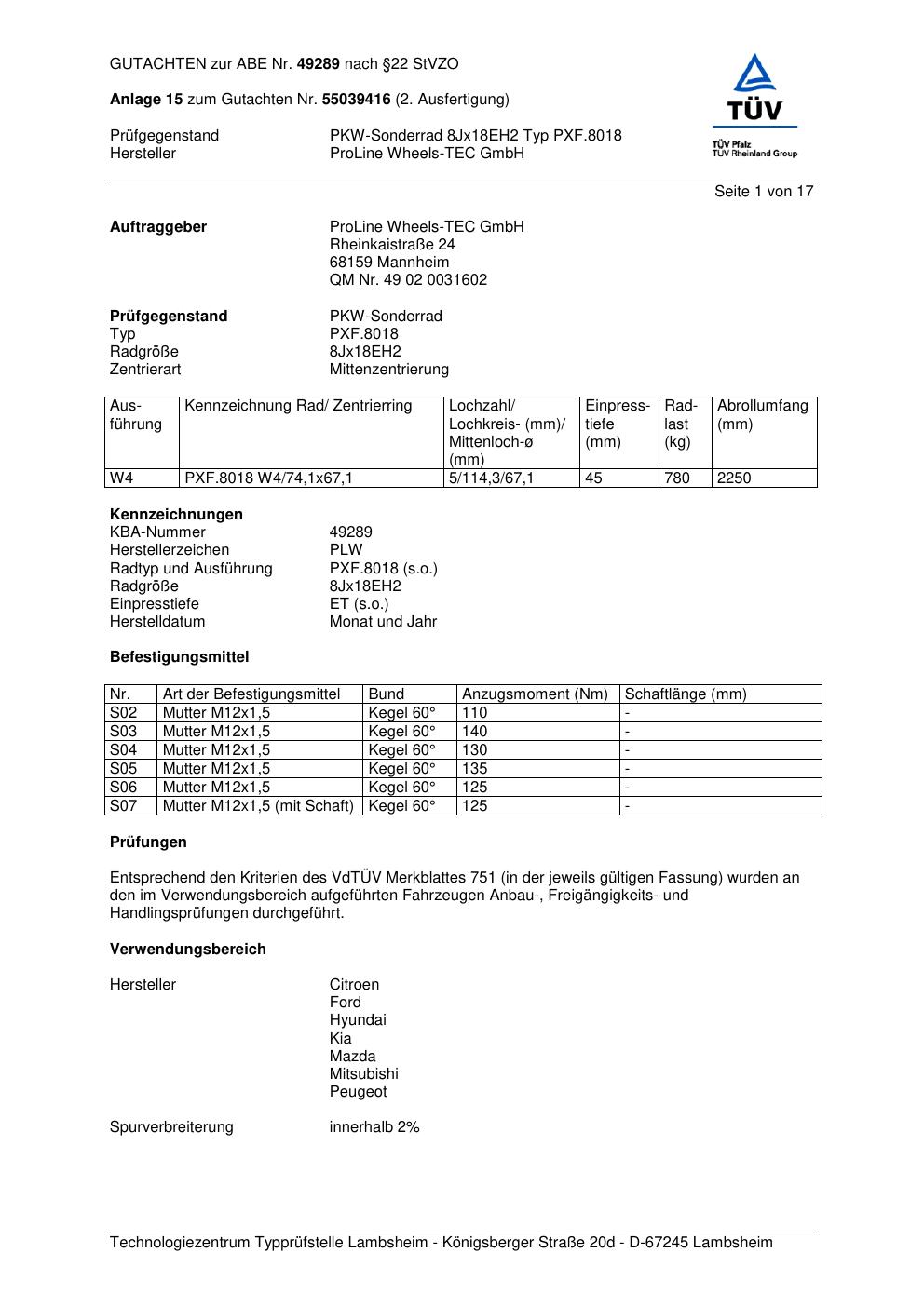 Dieses Gutachten (ABE) bezieht sich auf die Alufelge Proline PXF.8018 in der Ausführung 8Jx18 ET 0, Mittenloch 0 mm (KBA 49289). Im PDF findest du typischerweise zulässige Reifengrößen, Auflagen/Anbauhinweise und – je nach Dokument – Hinweise zur Eintragung.