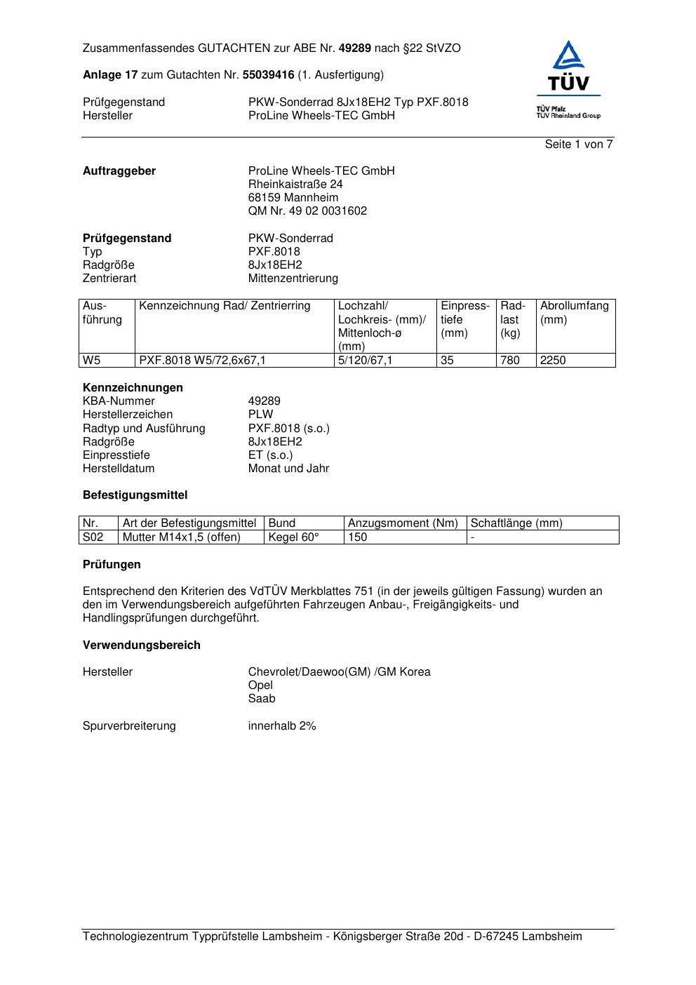 Dieses Gutachten (ABE) bezieht sich auf die Alufelge Proline PXF.8018 in der Ausführung 8Jx18 ET 0, Mittenloch 0 mm (KBA 49289). Im PDF findest du typischerweise zulässige Reifengrößen, Auflagen/Anbauhinweise und – je nach Dokument – Hinweise zur Eintragung.