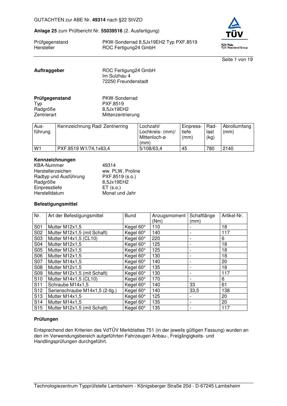 Dieses Gutachten (ABE) bezieht sich auf die Alufelge Proline PXF.8519 in der Ausführung 8.5Jx19 ET 0, Mittenloch 0 mm (KBA 49314). Im PDF findest du typischerweise zulässige Reifengrößen, Auflagen/Anbauhinweise und – je nach Dokument – Hinweise zur Eintragung.