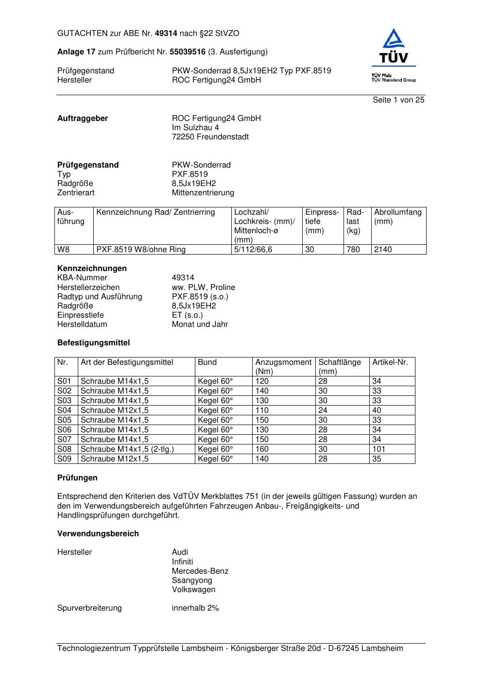 Felgengutachten / ABE für Alufelgen Proline PXF.8519 (8.5Jx19 ET 0, Mittenloch 0 mm) mit KBA 49314 (Zertifikatsnummer KBA 49314). Hier kostenlos als PDF herunterladen. Der Download-Link ist 24 Stunden gültig und kann bis zu zwei Mal verwendet werden.