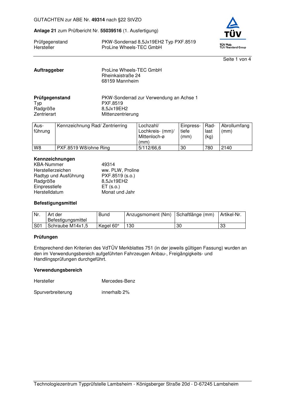 Dieses Gutachten (ABE) bezieht sich auf die Alufelge Proline PXF.8519 in der Ausführung 8.5Jx19 ET 0, Mittenloch 0 mm (KBA 49314). Im PDF findest du typischerweise zulässige Reifengrößen, Auflagen/Anbauhinweise und – je nach Dokument – Hinweise zur Eintragung.