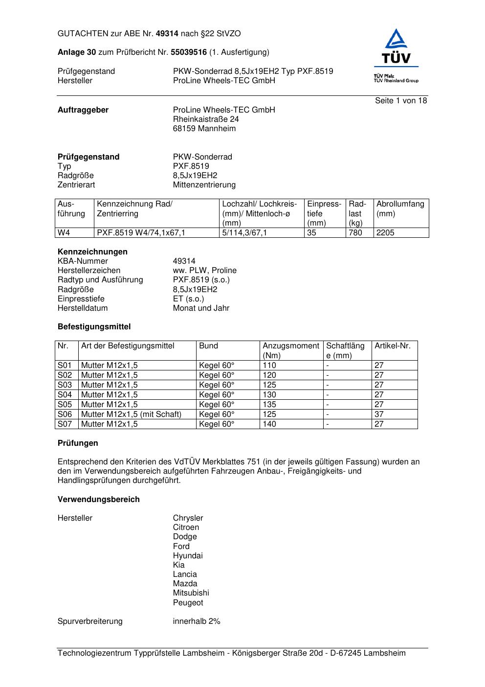 Dieses Gutachten (ABE) bezieht sich auf die Alufelge Proline PXF.8519 in der Ausführung 8.5Jx19 ET 0, Mittenloch 0 mm (KBA 49314). Im PDF findest du typischerweise zulässige Reifengrößen, Auflagen/Anbauhinweise und – je nach Dokument – Hinweise zur Eintragung.