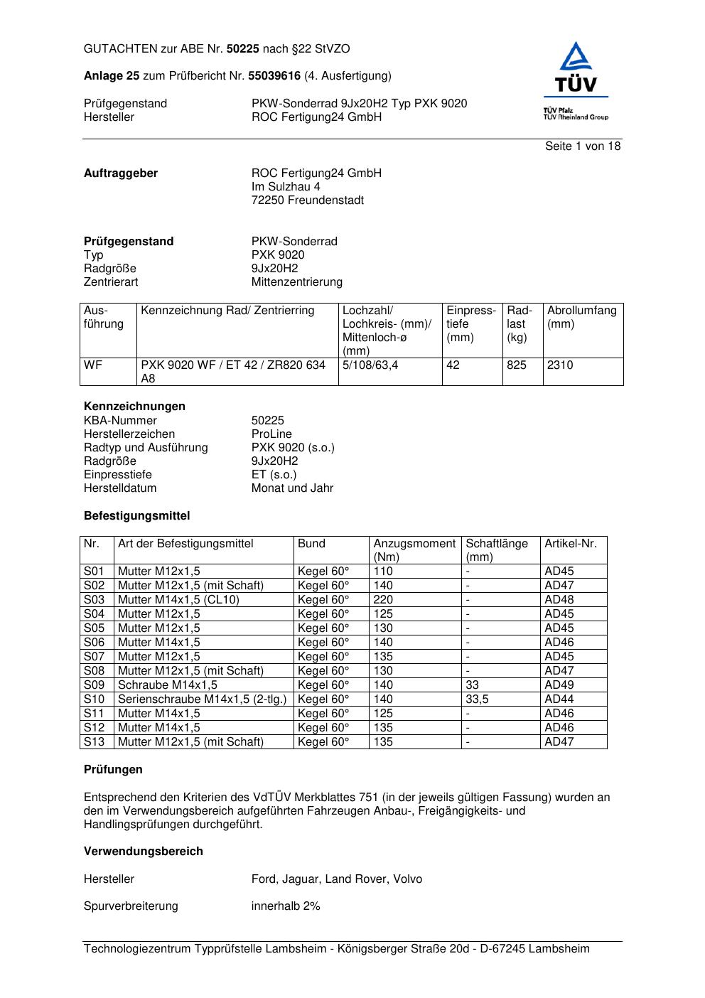Dieses Gutachten (ABE) bezieht sich auf die Alufelge Proline PXK in der Ausführung 9Jx2 ET 0, Mittenloch 0 mm (KBA 50225). Im PDF findest du typischerweise zulässige Reifengrößen, Auflagen/Anbauhinweise und – je nach Dokument – Hinweise zur Eintragung.