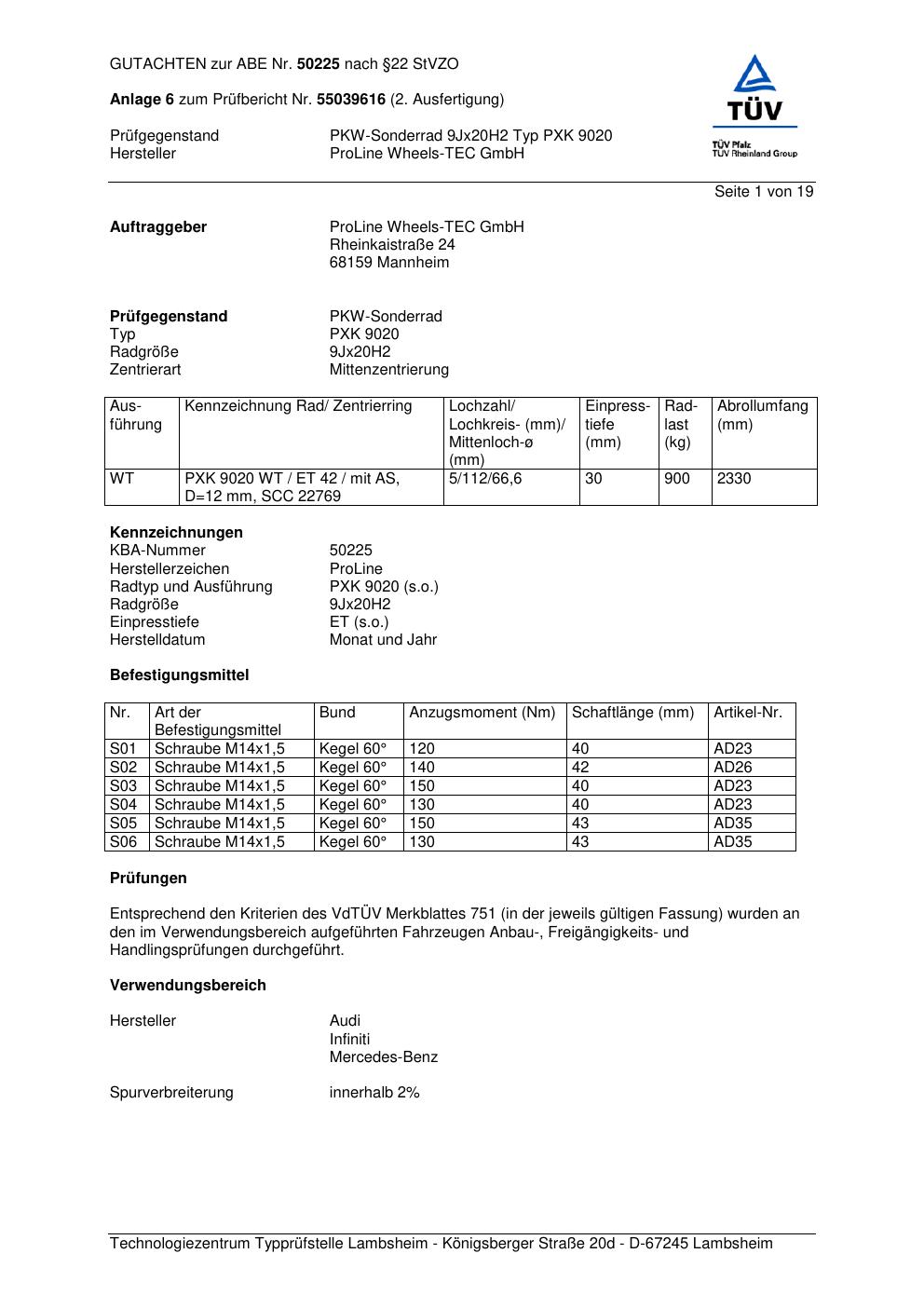 Felgengutachten / ABE für Alufelgen Proline PXK (9Jx2 ET 0, Mittenloch 0 mm) mit KBA 50225 (Zertifikatsnummer KBA 50225). Hier kostenlos als PDF herunterladen. Der Download-Link ist 24 Stunden gültig und kann bis zu zwei Mal verwendet werden.