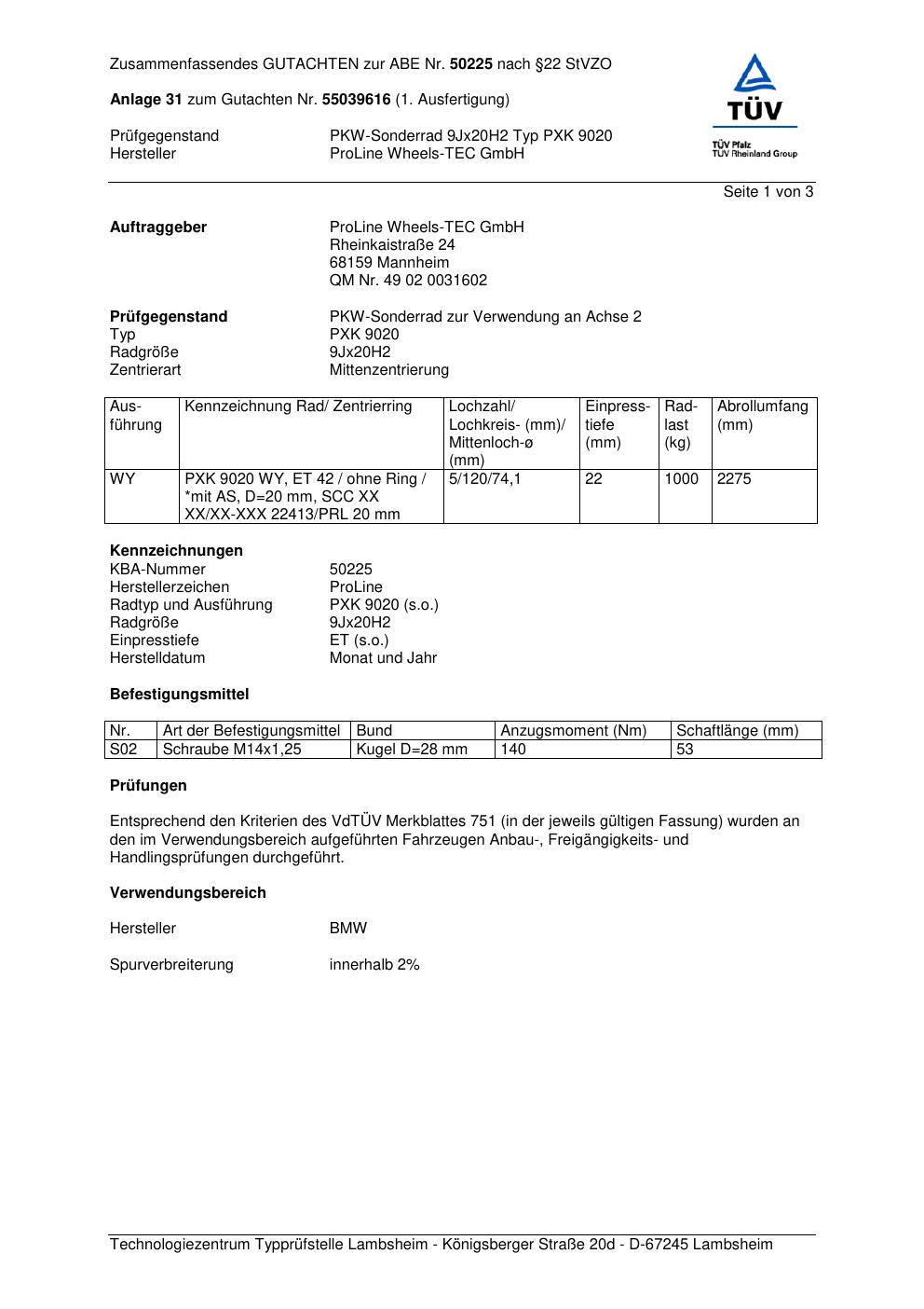 Dieses Gutachten (ABE) bezieht sich auf die Alufelge Proline PXK in der Ausführung 9Jx2 ET 0, Mittenloch 0 mm (KBA 50225). Im PDF findest du typischerweise zulässige Reifengrößen, Auflagen/Anbauhinweise und – je nach Dokument – Hinweise zur Eintragung.