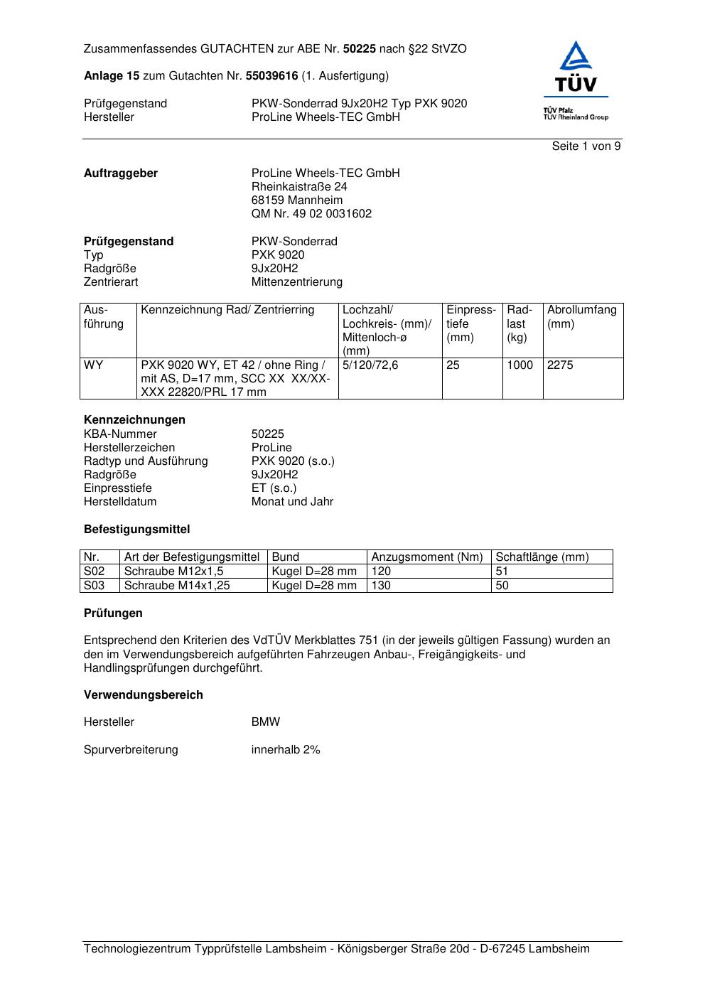 Dieses Gutachten (ABE) bezieht sich auf die Alufelge Proline PXK in der Ausführung 9Jx2 ET 0, Mittenloch 0 mm (KBA 50225). Im PDF findest du typischerweise zulässige Reifengrößen, Auflagen/Anbauhinweise und – je nach Dokument – Hinweise zur Eintragung.