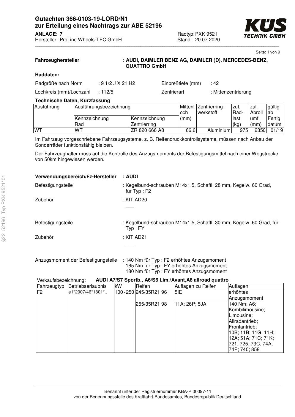 Felgengutachten / ABE für Alufelgen Proline PXK (9.5Jx21 ET 0, Mittenloch 0 mm) mit KBA 52196 (Zertifikatsnummer KBA 52196). Hier kostenlos als PDF herunterladen. Der Download-Link ist 24 Stunden gültig und kann bis zu zwei Mal verwendet werden.