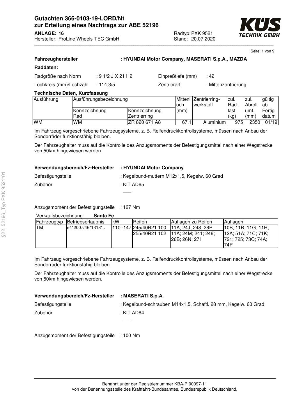 Felgengutachten / ABE für Alufelgen Proline PXK (9.5Jx21 ET 0, Mittenloch 0 mm) mit KBA 52196 (Zertifikatsnummer KBA 52196). Hier kostenlos als PDF herunterladen. Der Download-Link ist 24 Stunden gültig und kann bis zu zwei Mal verwendet werden.