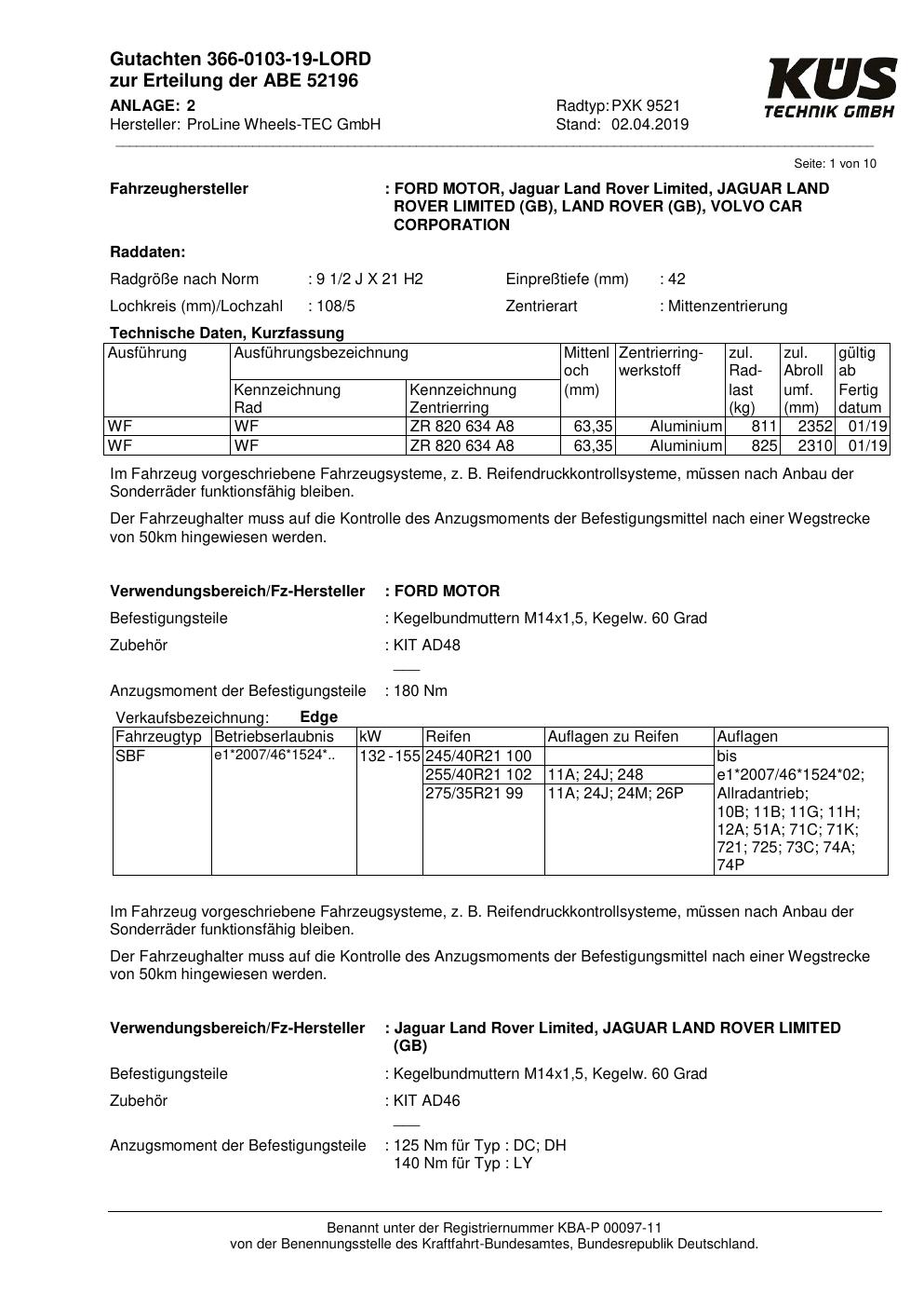 Felgengutachten / ABE für Alufelgen Proline PXK (9.5Jx21 ET 0, Mittenloch 0 mm) mit KBA 52196 (Zertifikatsnummer KBA 52196). Hier kostenlos als PDF herunterladen. Der Download-Link ist 24 Stunden gültig und kann bis zu zwei Mal verwendet werden.