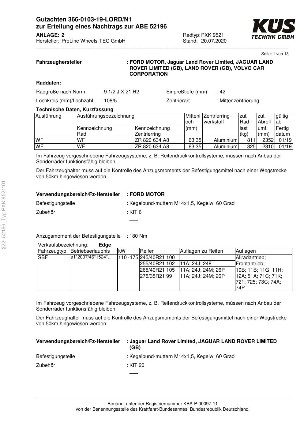 Felgengutachten / ABE für Alufelgen Proline PXK (9.5Jx21 ET 0, Mittenloch 0 mm) mit KBA 52196 (Zertifikatsnummer KBA 52196). Hier kostenlos als PDF herunterladen. Der Download-Link ist 24 Stunden gültig und kann bis zu zwei Mal verwendet werden.