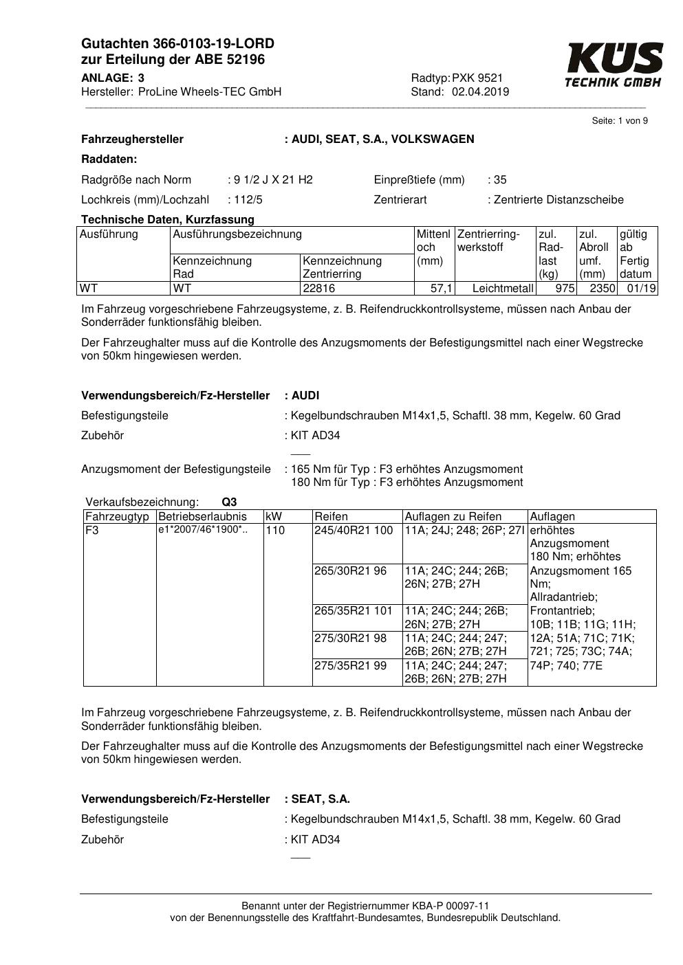 Felgengutachten / ABE für Alufelgen Proline PXK (9.5Jx21 ET 0, Mittenloch 0 mm) mit KBA 52196 (Zertifikatsnummer KBA 52196). Hier kostenlos als PDF herunterladen. Der Download-Link ist 24 Stunden gültig und kann bis zu zwei Mal verwendet werden.