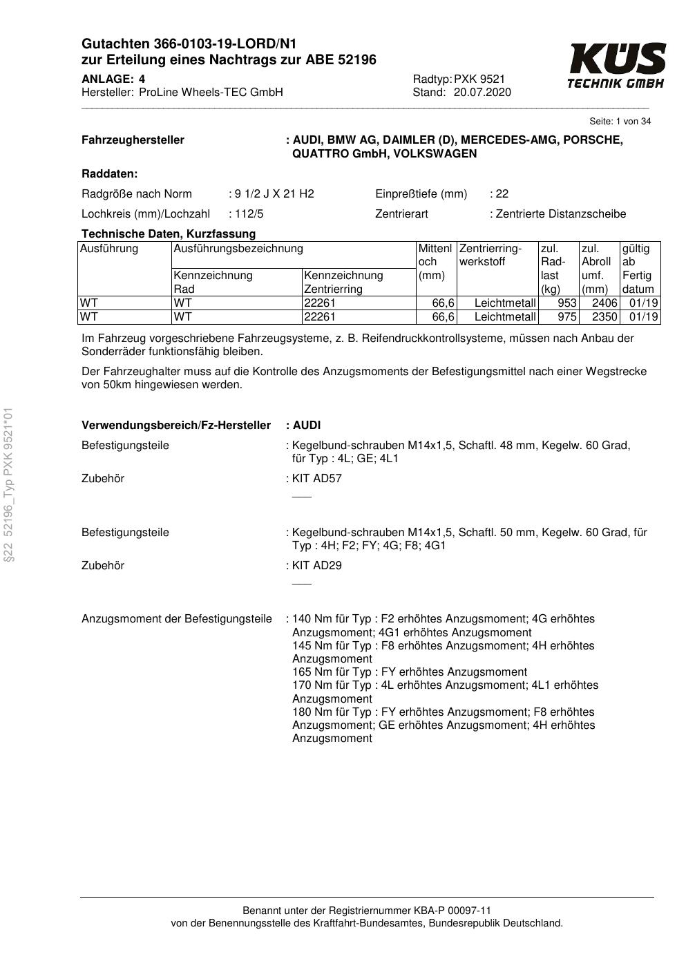 Dieses ABE gehört zur Felge Proline PXK in 9.5Jx21 ET0 mit KBA 52196. Die Seite ist dafür gedacht, dass du schnell prüfen kannst, ob KBA, Design und Größe zu deiner Felge passen und danach direkt das richtige PDF lädst.