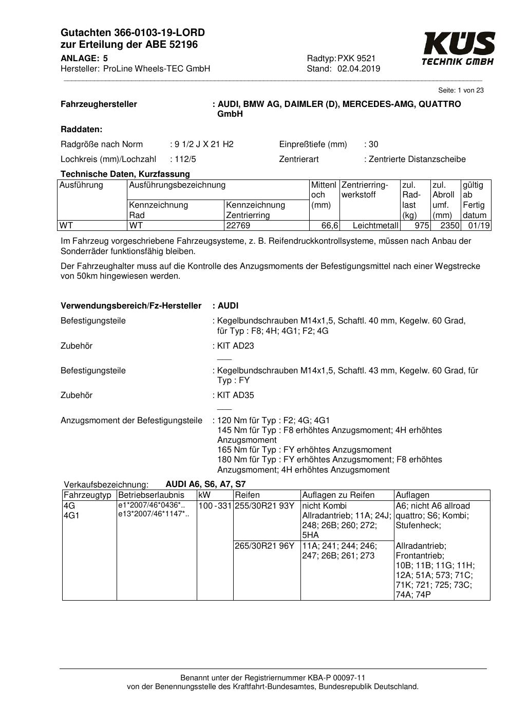 Felgengutachten / ABE für Alufelgen Proline PXK (9.5Jx21 ET 0, Mittenloch 0 mm) mit KBA 52196 (Zertifikatsnummer KBA 52196). Hier kostenlos als PDF herunterladen. Der Download-Link ist 24 Stunden gültig und kann bis zu zwei Mal verwendet werden.
