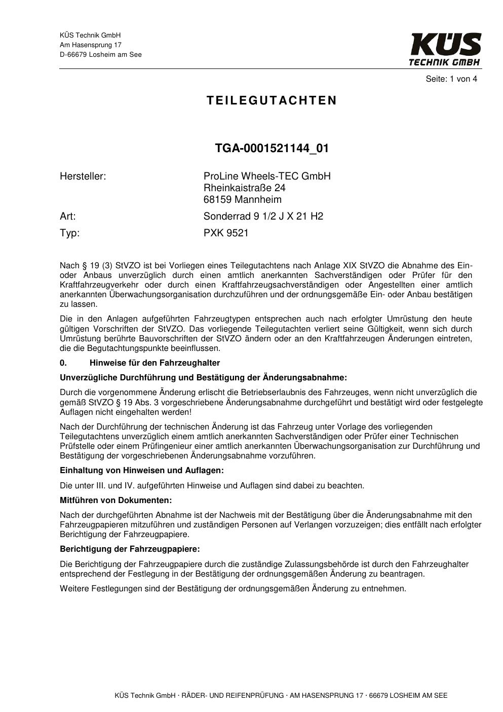 Felgengutachten / ABE für Alufelgen Proline PXK (9.5Jx21 ET 0, Mittenloch 0 mm) mit KBA 52196 (Zertifikatsnummer KBA 52196). Hier kostenlos als PDF herunterladen. Der Download-Link ist 24 Stunden gültig und kann bis zu zwei Mal verwendet werden.