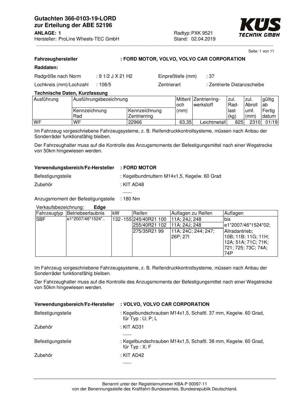 Felgengutachten / ABE für Alufelgen Proline PXK (9.5Jx21 ET 0, Mittenloch 0 mm) mit KBA 52196 (Zertifikatsnummer KBA 52196). Hier kostenlos als PDF herunterladen. Der Download-Link ist 24 Stunden gültig und kann bis zu zwei Mal verwendet werden.