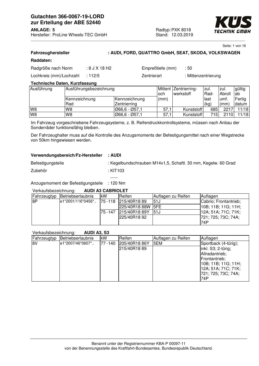 Felgengutachten / ABE für Alufelgen Proline PXK (8Jx18 ET 0, Mittenloch 0 mm) mit KBA 52440 (Zertifikatsnummer KBA 52440). Hier kostenlos als PDF herunterladen. Der Download-Link ist 24 Stunden gültig und kann bis zu zwei Mal verwendet werden.