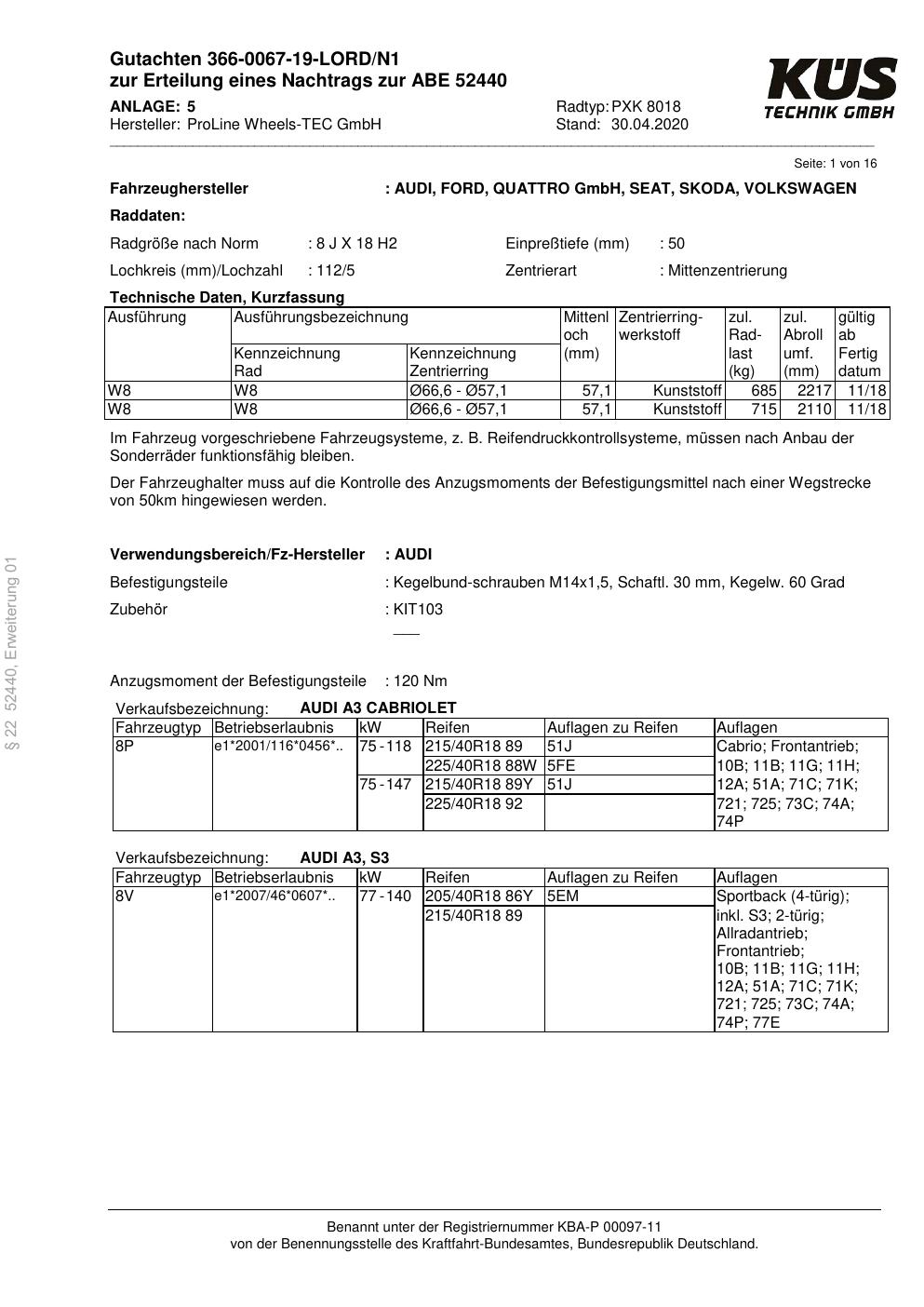 Felgengutachten / ABE für Alufelgen Proline PXK (8Jx18 ET 0, Mittenloch 0 mm) mit KBA 52440 (Zertifikatsnummer KBA 52440). Hier kostenlos als PDF herunterladen. Der Download-Link ist 24 Stunden gültig und kann bis zu zwei Mal verwendet werden.