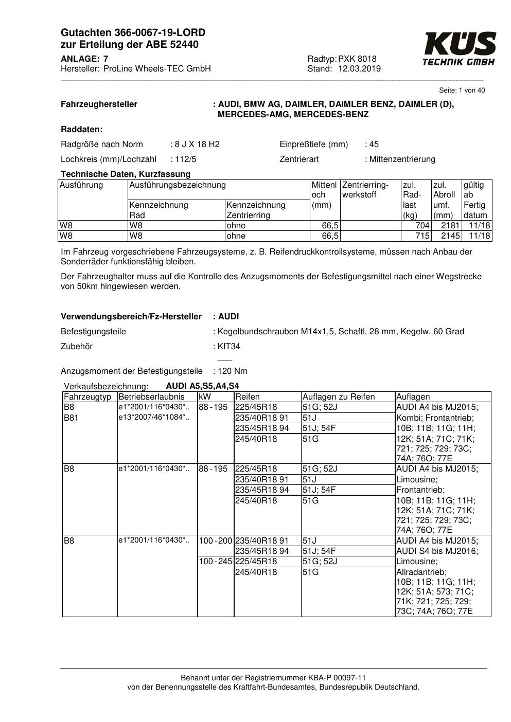Felgengutachten / ABE für Alufelgen Proline PXK (8Jx18 ET 0, Mittenloch 0 mm) mit KBA 52440 (Zertifikatsnummer KBA 52440). Hier kostenlos als PDF herunterladen. Der Download-Link ist 24 Stunden gültig und kann bis zu zwei Mal verwendet werden.