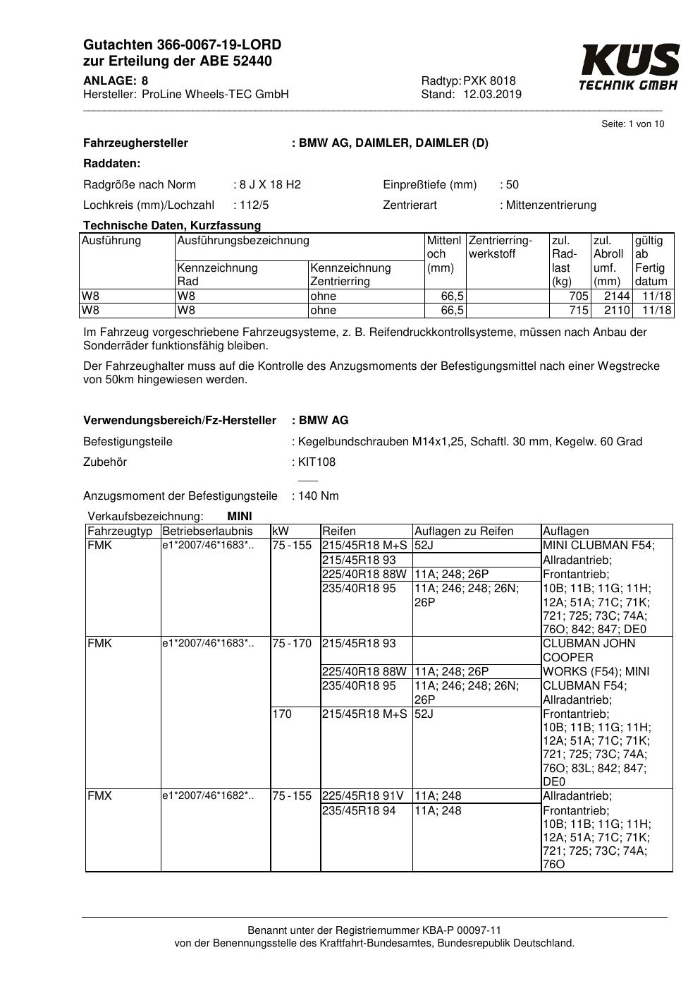Dieses Gutachten (ABE) bezieht sich auf die Alufelge Proline PXK in der Ausführung 8Jx18 ET 0, Mittenloch 0 mm (KBA 52440). Im PDF findest du typischerweise zulässige Reifengrößen, Auflagen/Anbauhinweise und – je nach Dokument – Hinweise zur Eintragung.