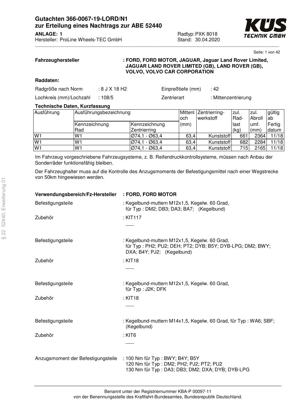 Felgengutachten / ABE für Alufelgen Proline PXK (8Jx18 ET 0, Mittenloch 0 mm) mit KBA 52440 (Zertifikatsnummer KBA 52440). Hier kostenlos als PDF herunterladen. Der Download-Link ist 24 Stunden gültig und kann bis zu zwei Mal verwendet werden.
