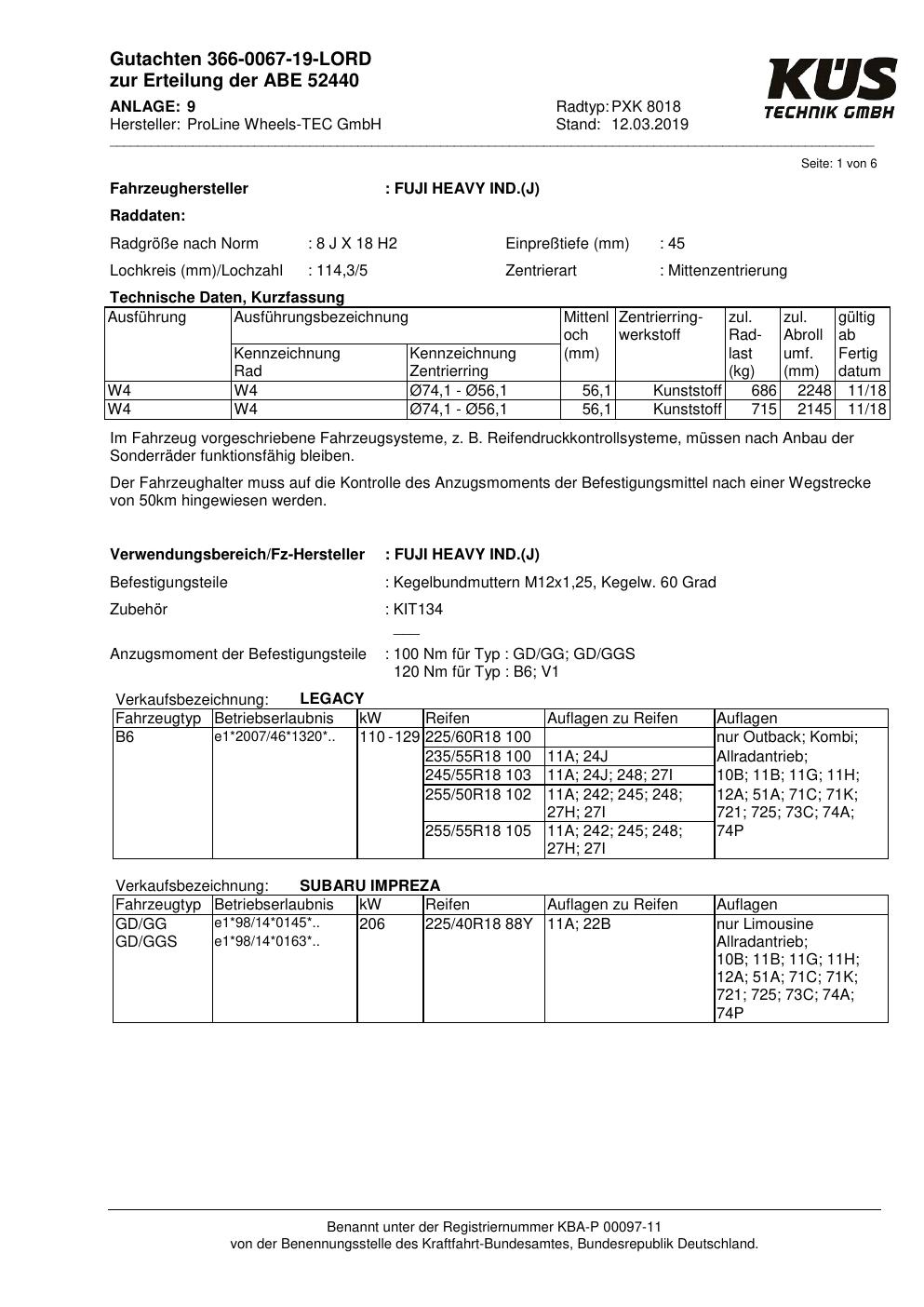 Felgengutachten / ABE für Alufelgen Proline PXK (8Jx18 ET 0, Mittenloch 0 mm) mit KBA 52440 (Zertifikatsnummer KBA 52440). Hier kostenlos als PDF herunterladen. Der Download-Link ist 24 Stunden gültig und kann bis zu zwei Mal verwendet werden.