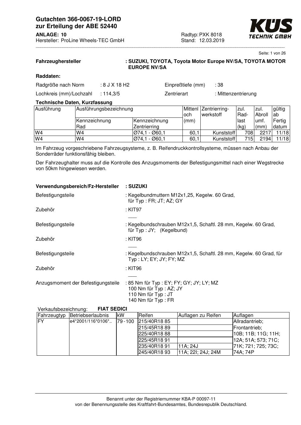 Dieses Gutachten (ABE) bezieht sich auf die Alufelge Proline PXK in der Ausführung 8Jx18 ET 0, Mittenloch 0 mm (KBA 52440). Im PDF findest du typischerweise zulässige Reifengrößen, Auflagen/Anbauhinweise und – je nach Dokument – Hinweise zur Eintragung.