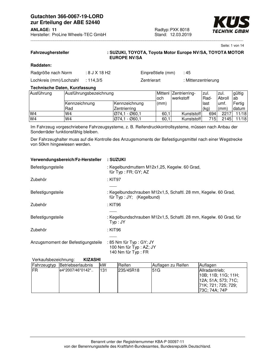 Dieses Gutachten (ABE) bezieht sich auf die Alufelge Proline PXK in der Ausführung 8Jx18 ET 0, Mittenloch 0 mm (KBA 52440). Im PDF findest du typischerweise zulässige Reifengrößen, Auflagen/Anbauhinweise und – je nach Dokument – Hinweise zur Eintragung.