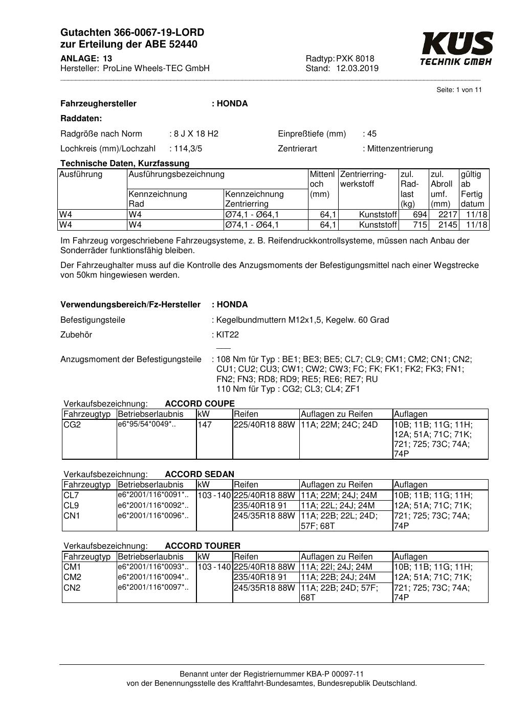 Felgengutachten / ABE für Alufelgen Proline PXK (8Jx18 ET 0, Mittenloch 0 mm) mit KBA 52440 (Zertifikatsnummer KBA 52440). Hier kostenlos als PDF herunterladen. Der Download-Link ist 24 Stunden gültig und kann bis zu zwei Mal verwendet werden.