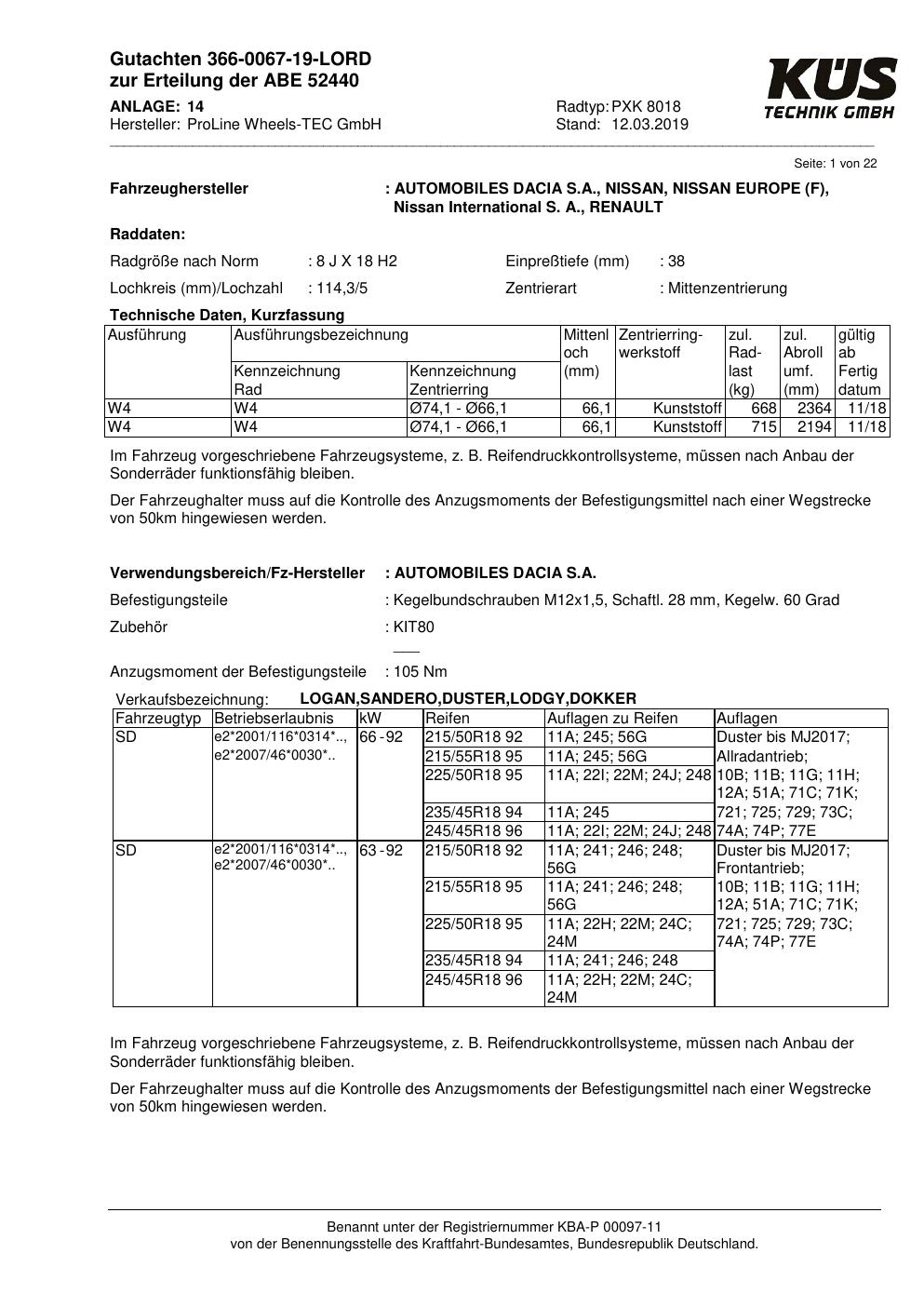 Felgengutachten / ABE für Alufelgen Proline PXK (8Jx18 ET 0, Mittenloch 0 mm) mit KBA 52440 (Zertifikatsnummer KBA 52440). Hier kostenlos als PDF herunterladen. Der Download-Link ist 24 Stunden gültig und kann bis zu zwei Mal verwendet werden.