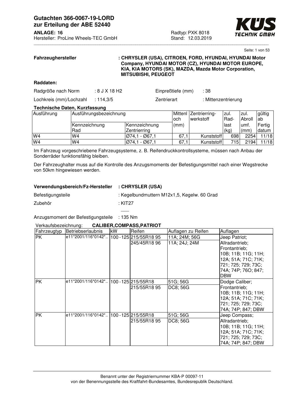 Felgengutachten / ABE für Alufelgen Proline PXK (8Jx18 ET 0, Mittenloch 0 mm) mit KBA 52440 (Zertifikatsnummer KBA 52440). Hier kostenlos als PDF herunterladen. Der Download-Link ist 24 Stunden gültig und kann bis zu zwei Mal verwendet werden.