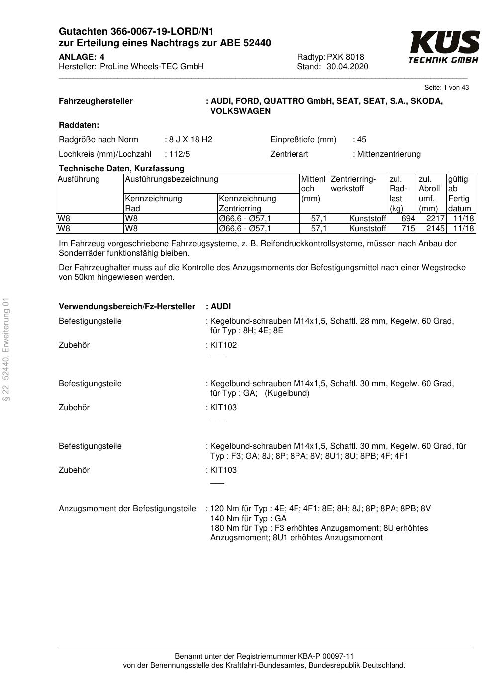 Felgengutachten / ABE für Alufelgen Proline PXK (8Jx18 ET 0, Mittenloch 0 mm) mit KBA 52440 (Zertifikatsnummer KBA 52440). Hier kostenlos als PDF herunterladen. Der Download-Link ist 24 Stunden gültig und kann bis zu zwei Mal verwendet werden.