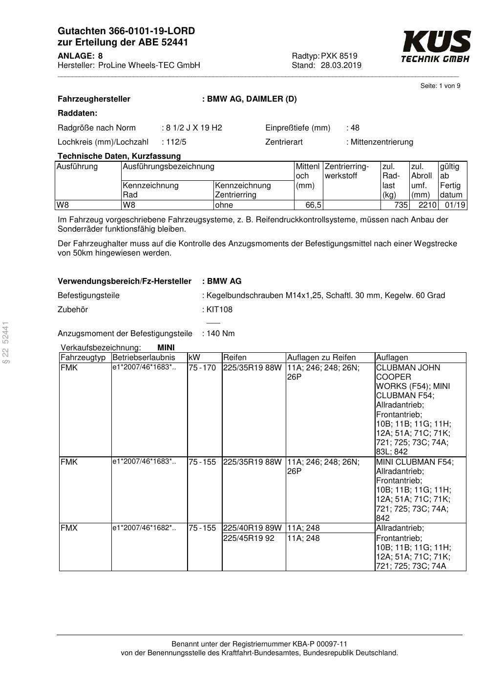 Felgengutachten / ABE für Alufelgen Proline PXK (8.5Jx19 ET 0, Mittenloch 0 mm) mit KBA 52441 (Zertifikatsnummer KBA 52441). Hier kostenlos als PDF herunterladen. Der Download-Link ist 24 Stunden gültig und kann bis zu zwei Mal verwendet werden.