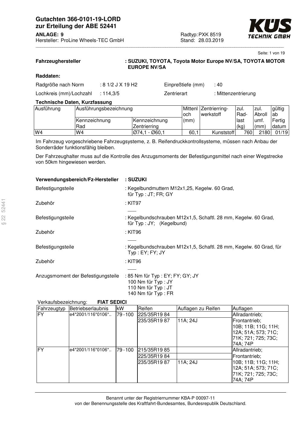 Dieses Gutachten (ABE) bezieht sich auf die Alufelge Proline PXK in der Ausführung 8.5Jx19 ET 0, Mittenloch 0 mm (KBA 52441). Im PDF findest du typischerweise zulässige Reifengrößen, Auflagen/Anbauhinweise und – je nach Dokument – Hinweise zur Eintragung.