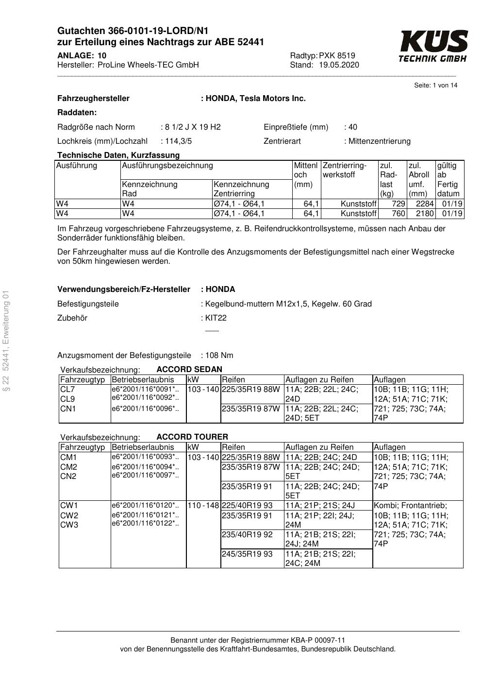 Felgengutachten / ABE für Alufelgen Proline PXK (8.5Jx19 ET 0, Mittenloch 0 mm) mit KBA 52441 (Zertifikatsnummer KBA 52441). Hier kostenlos als PDF herunterladen. Der Download-Link ist 24 Stunden gültig und kann bis zu zwei Mal verwendet werden.