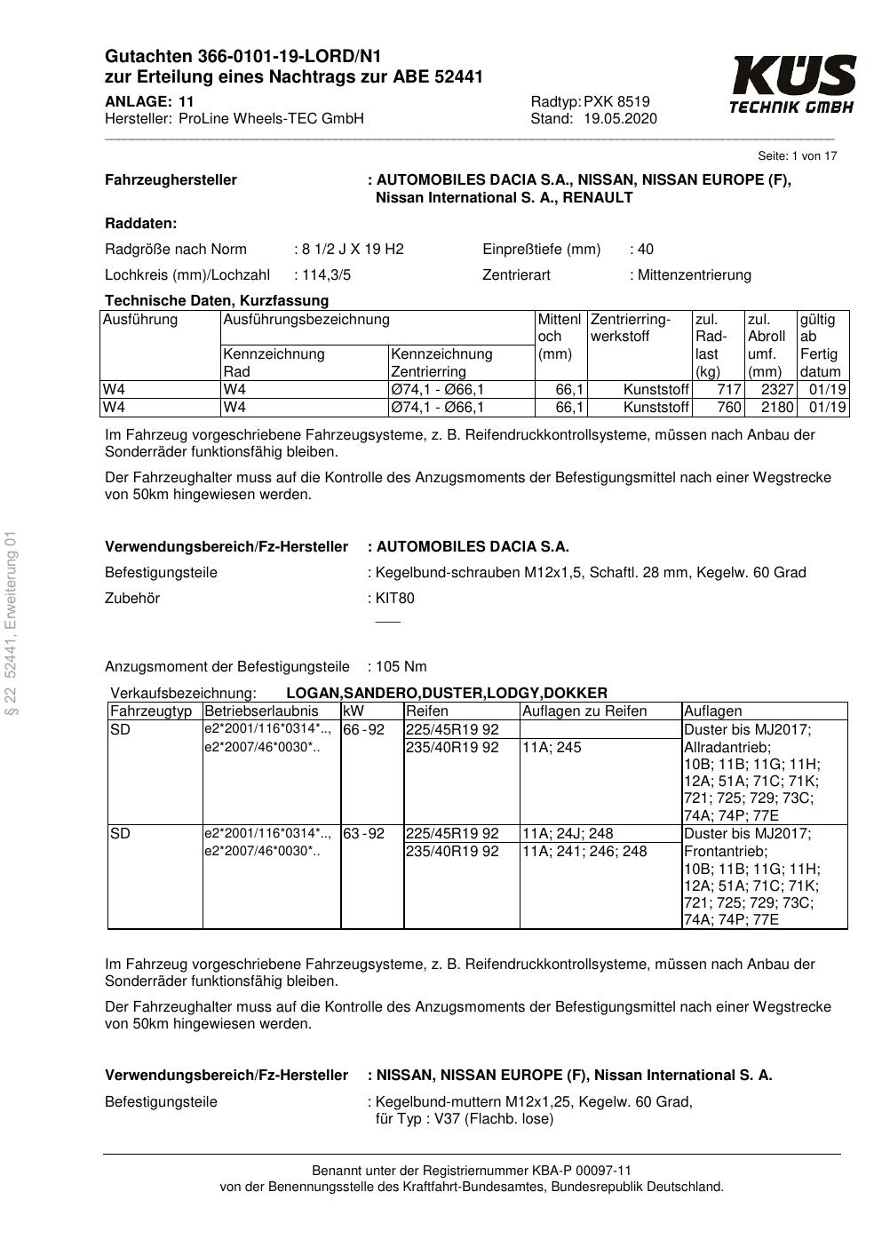 Dieses Gutachten (ABE) bezieht sich auf die Alufelge Proline PXK in der Ausführung 8.5Jx19 ET 0, Mittenloch 0 mm (KBA 52441). Im PDF findest du typischerweise zulässige Reifengrößen, Auflagen/Anbauhinweise und – je nach Dokument – Hinweise zur Eintragung.