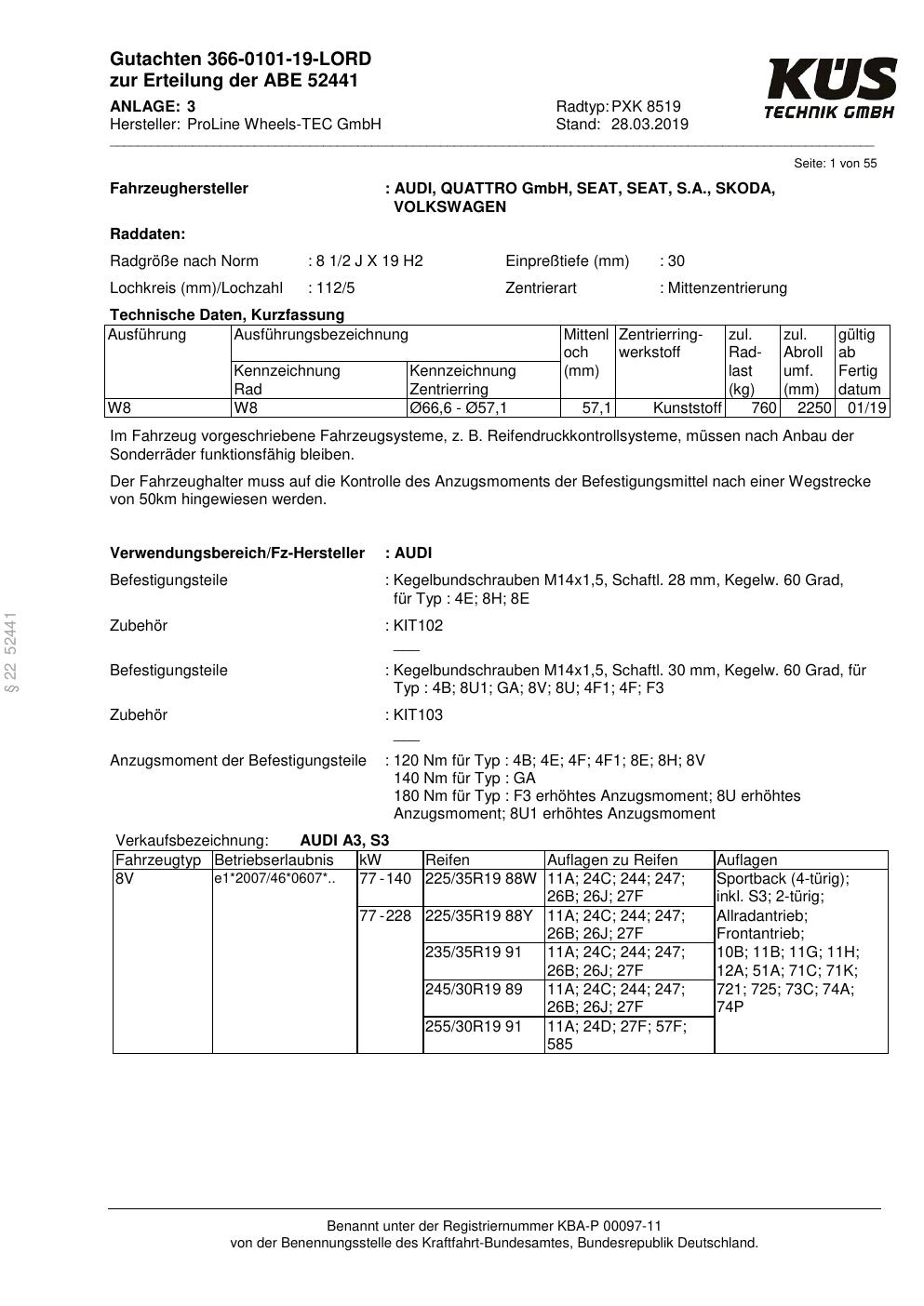 Felgengutachten / ABE für Alufelgen Proline PXK (8.5Jx19 ET 0, Mittenloch 0 mm) mit KBA 52441 (Zertifikatsnummer KBA 52441). Hier kostenlos als PDF herunterladen. Der Download-Link ist 24 Stunden gültig und kann bis zu zwei Mal verwendet werden.